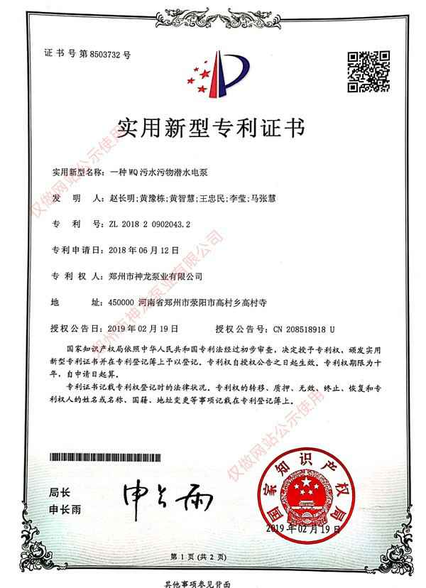 WQ污水污物潜水电泵专利证